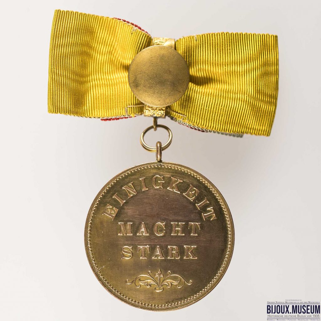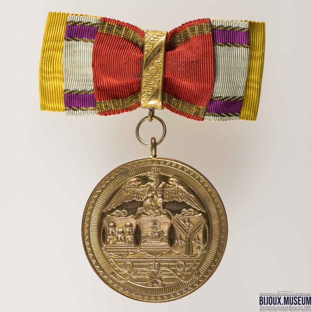 Gemeinsames Besuchsabzeichen der sog. altpreußischen Großlogen (GNML, Große Landesloge der Freimaurer von Deutschland und Große Loge von Preußen, genannt Royal York zur Freundschaft) in Berlin, wohl von etwa ab 1860. Im oberen Teil wurden die Bänder der Großlogen in einer Art Schleifenform eingeklemmt.